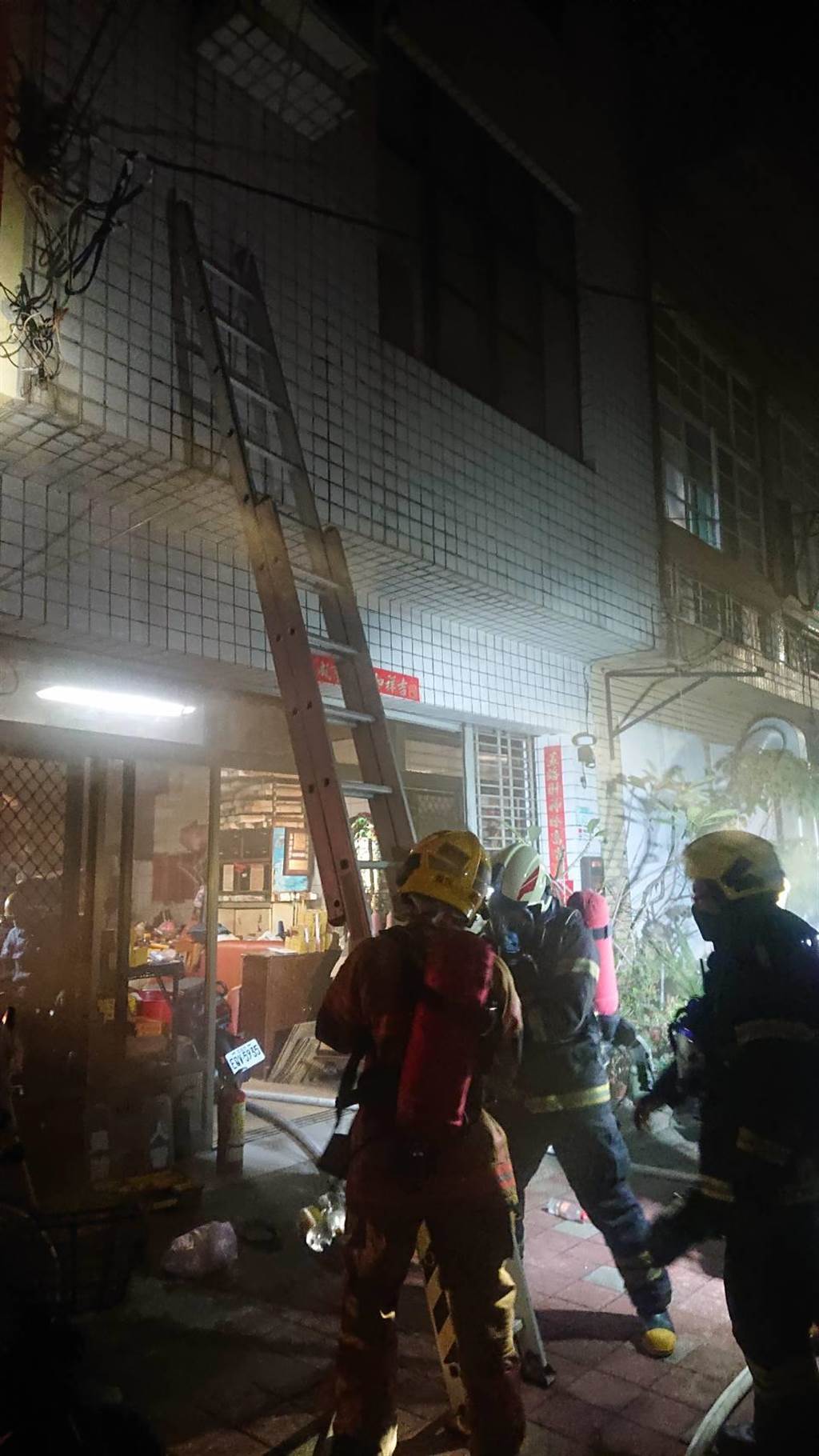 警消人員在現場架梯準備從前門灌救撲滅火勢。(程炳璋攝)