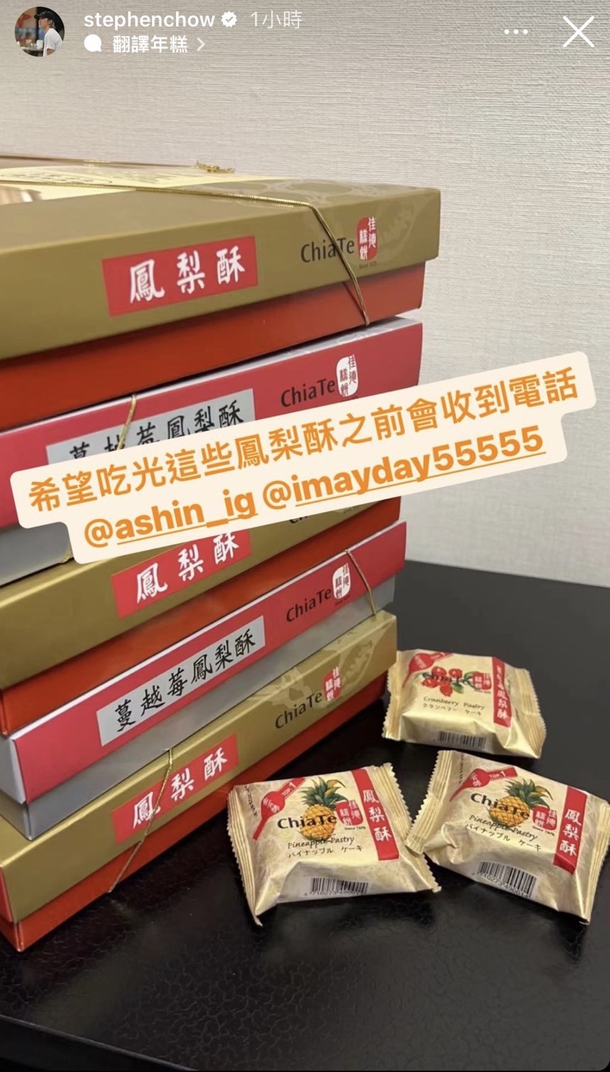 。」他隨後還在限時動態PO出整整5盒鳳梨酥的照片,隔空向阿信喊話:「希望吃光這些