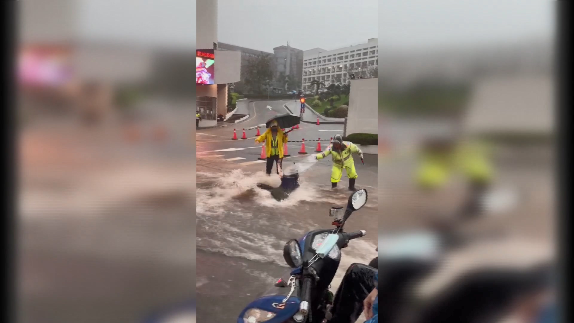 台中台灣大道上,大淹水水流相當湍急,一名女子直接被沖走,警衛根本來不及抓住她。