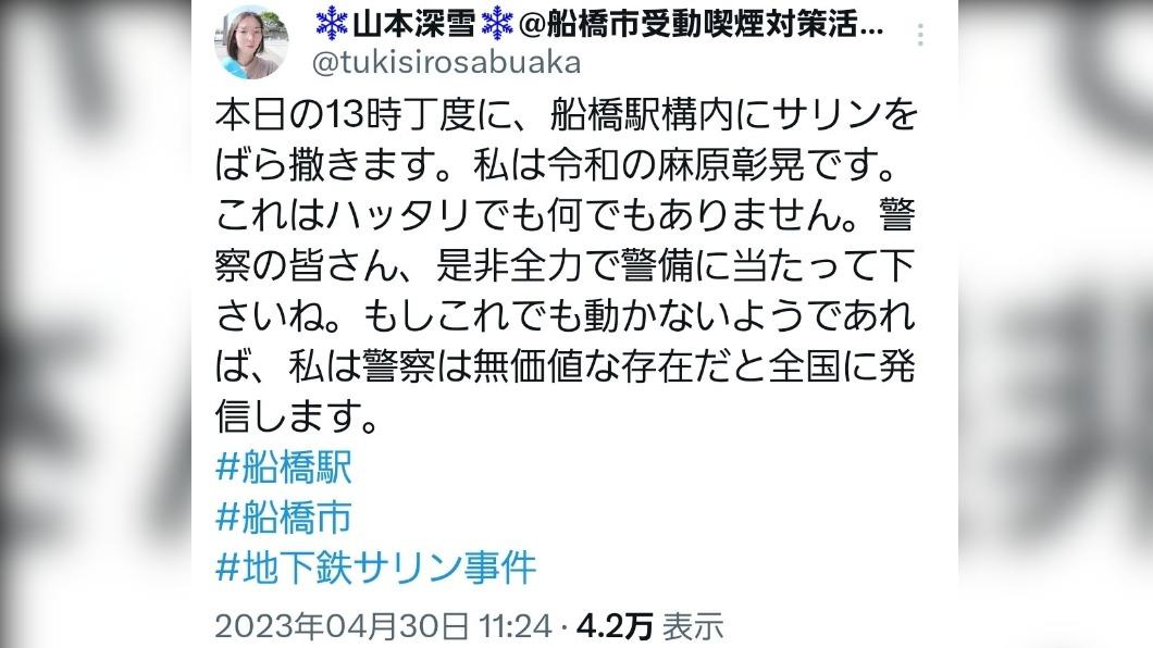 落選後,於昨(30日)在推特PO文放話:「我今天下午1點要在車站內散播沙林毒氣」,