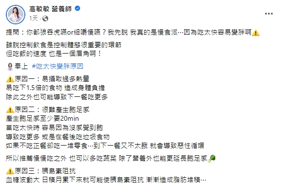 高敏敏呼籲進食速度應放慢。(圖/翻攝自高敏敏臉書)