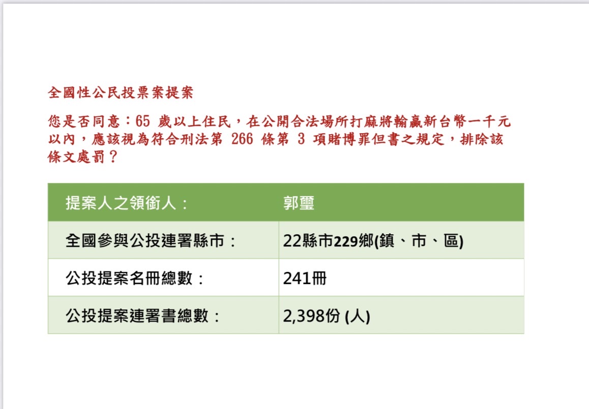 郭璽先生領銜提出之「您是否同意:65歲以上住民,在公開合法場所打麻將輸贏新台幣一