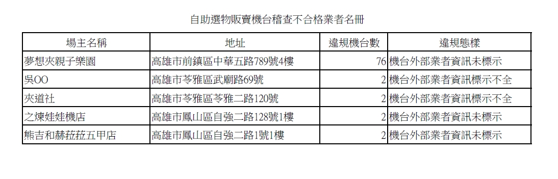 轄內104處夾娃娃機店,查獲5家業者所屬的84台機台資訊標示違規。其中位於高雄夢時代