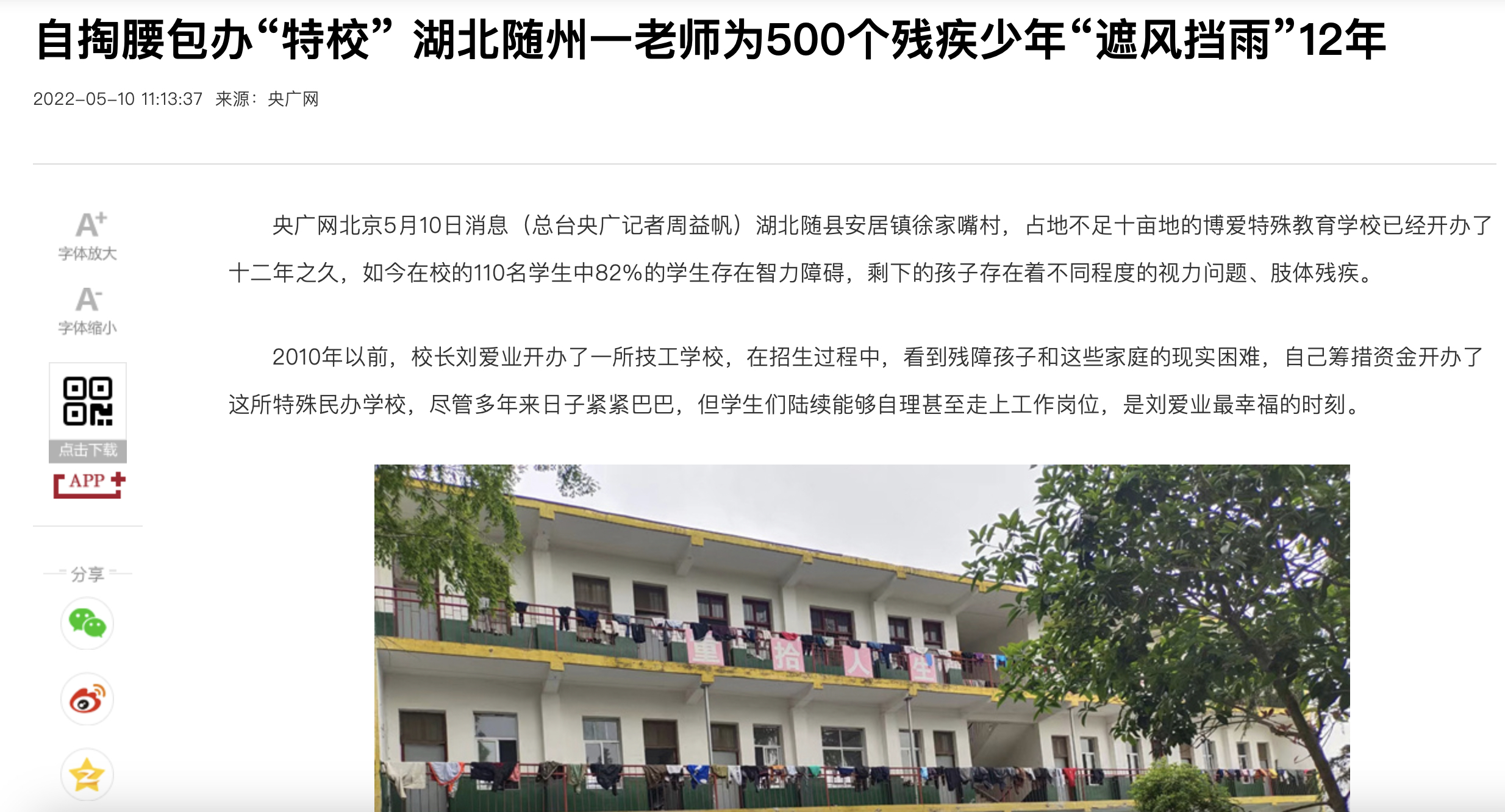 然而在網上,這所名叫「隨縣博愛特殊教育學校」口碑頗佳。校長劉愛業的事蹟曾多次被