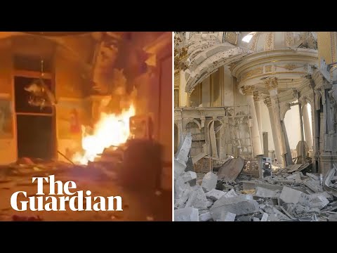 影像畫面顯示,大教堂內部滿是碎片。烏克蘭官員說,在瓦礫堆中找到了敖德薩的守護神