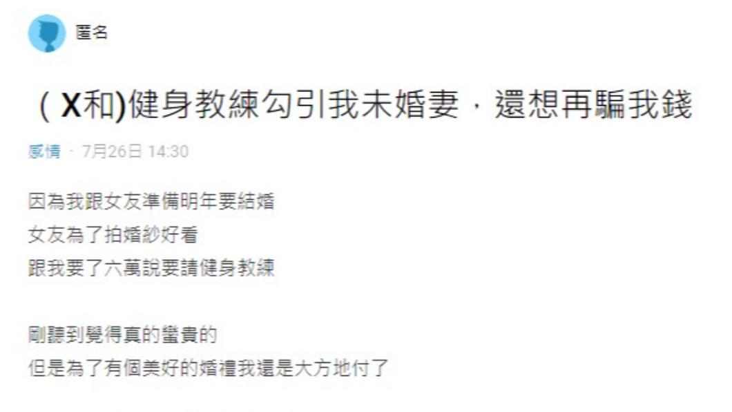 原PO在網路上抱怨健身教練勾引未婚妻。(圖/翻攝自Dcard)