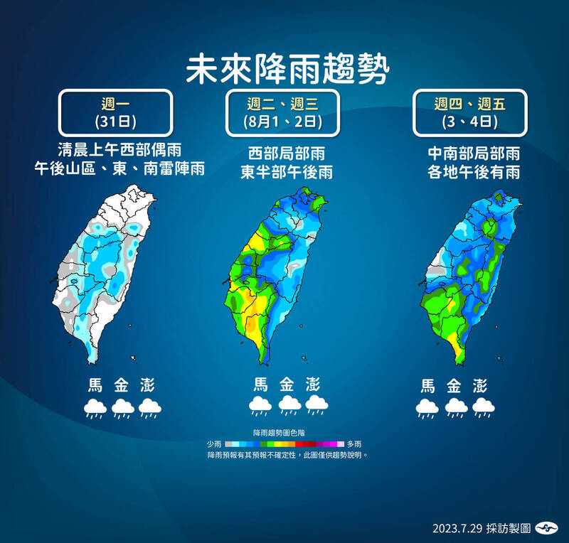 都有短暫陣雨,西半部也偶有飄雨,各地都有午後雷陣雨,西半部、各地山區易有較大雨