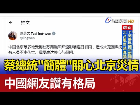 蔡總統「簡體字」關心北京災情 中國網友讚有格局