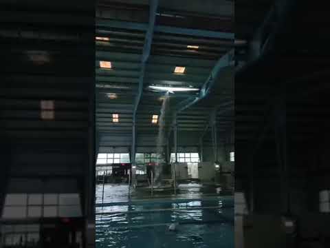 歸仁游泳池屋頂「天降瀑布」,讓民眾看傻眼。(讀者提供/曹婷婷台南傳真)