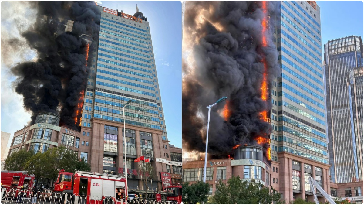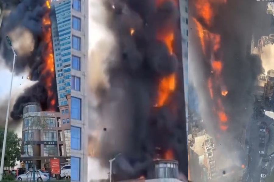 2023年8月22日,天津市南開區新天地大廈突發大火。(影片截圖合成)