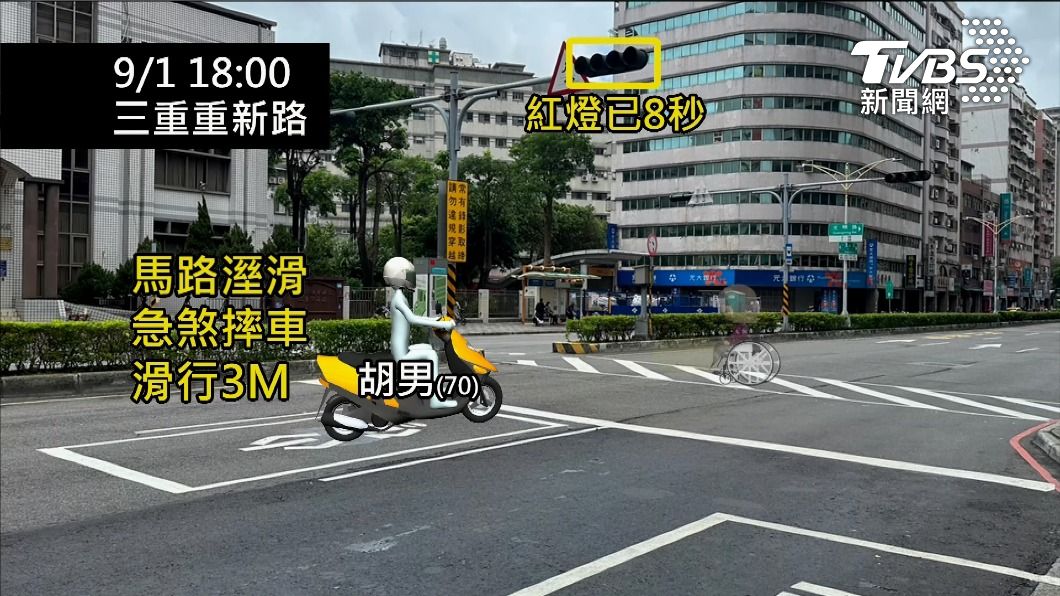 由於剛下過雨,馬路格外潮濕,70歲的胡姓騎士急忙煞車,但已來不及了。他先自摔倒地