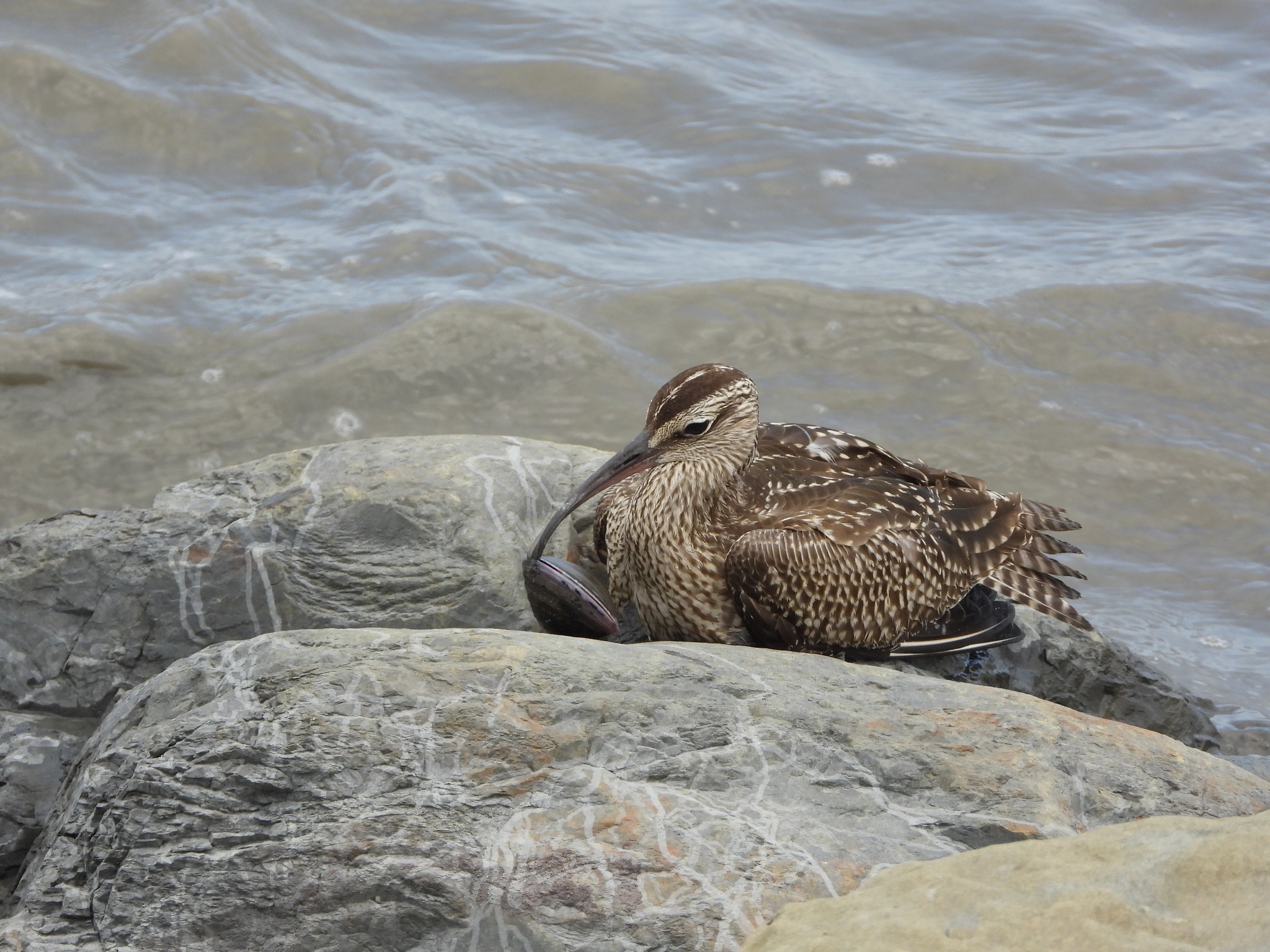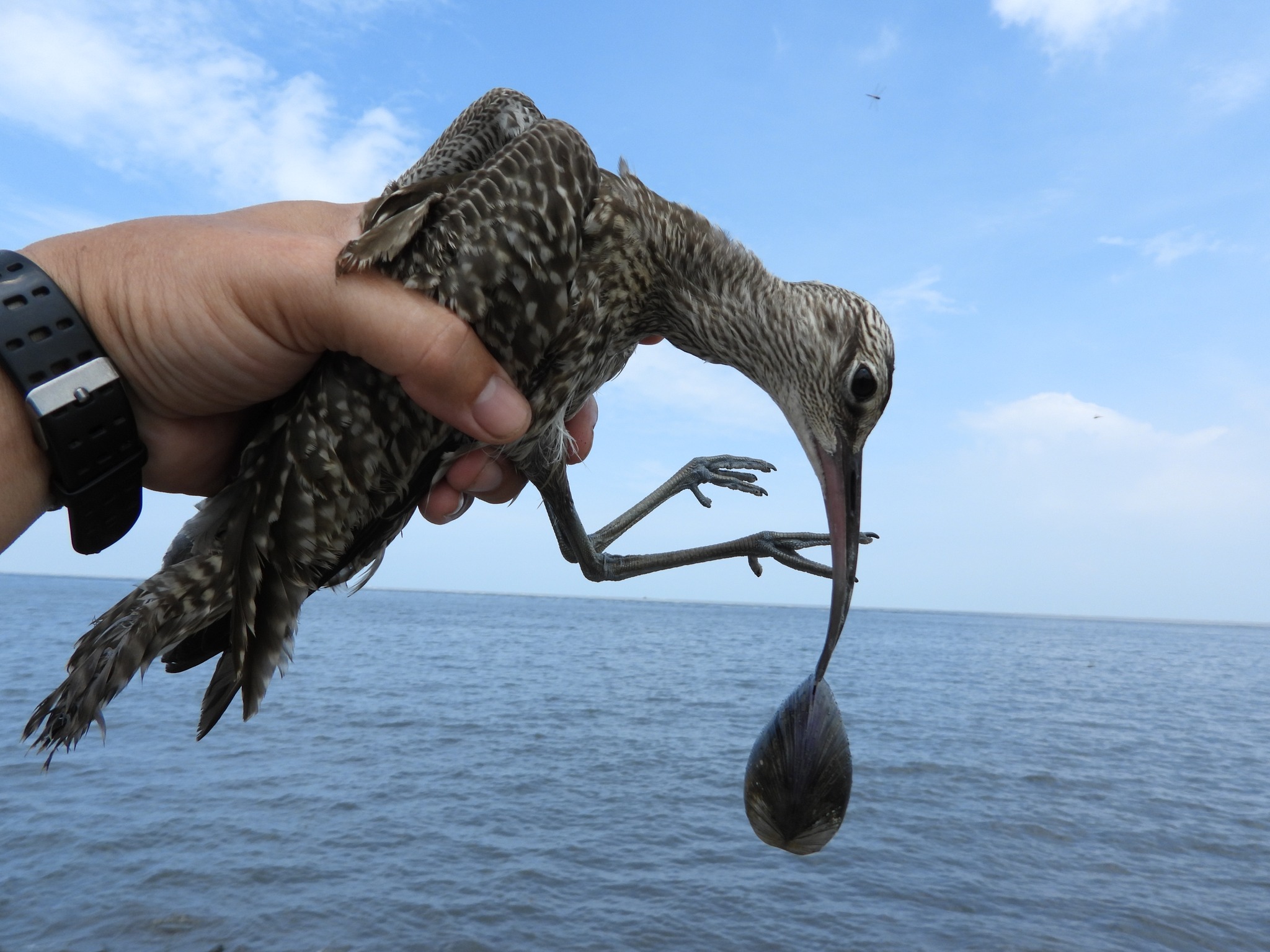 嘴蛤給扳開。重獲自由的中杓鷸很快就飛走了,他再幫這顆赤嘴蛤拍紀念照,就丟回大海