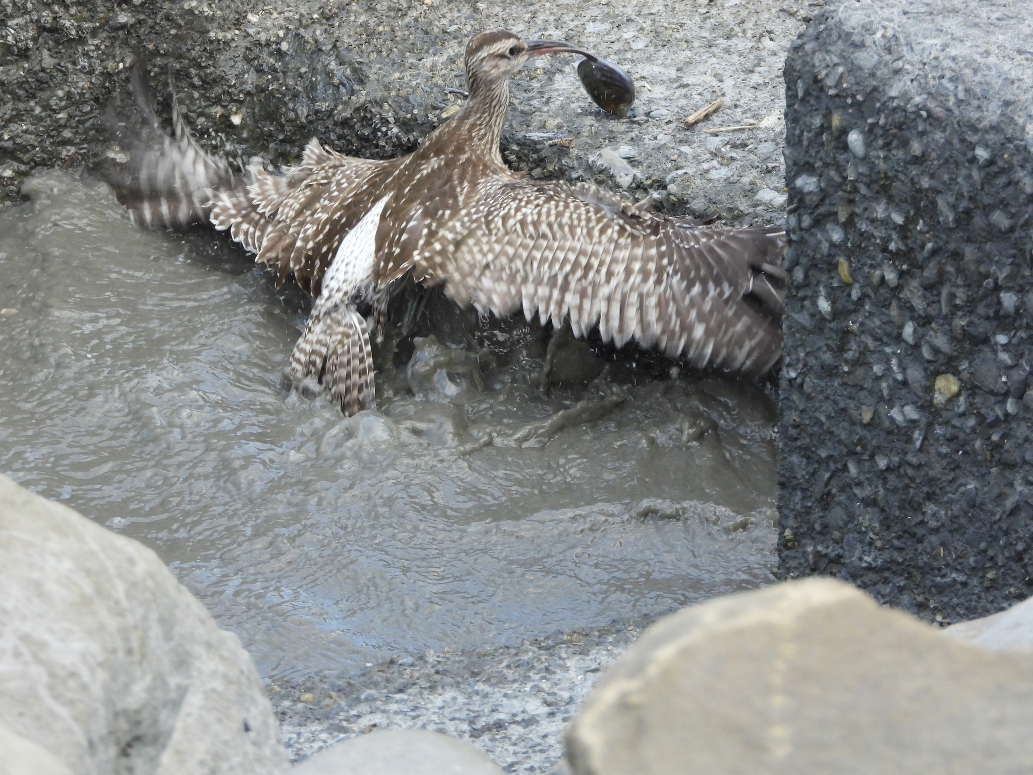 杓鷸已經被潮水逼到堤岸邊,堤岸頂約有兩公尺多的高度,過不了多久,中杓鷸可能就要