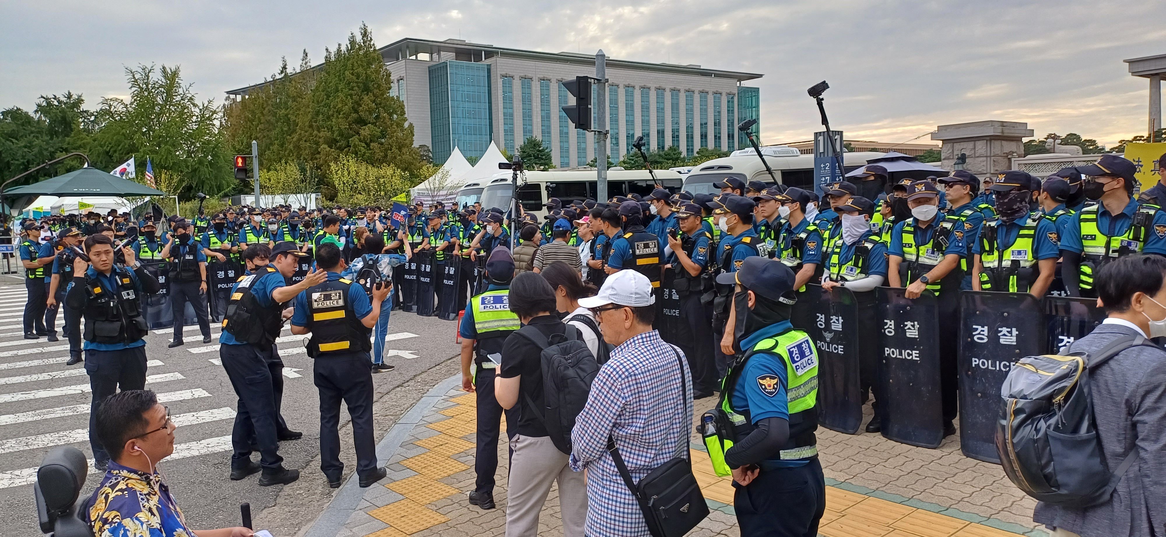 被現場警察圍堵在韓國國會大廈門外的抗議者。(金明國/大紀元)