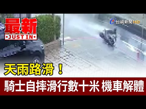 天雨路滑!騎士自摔滑行數十米 機車瞬間解體