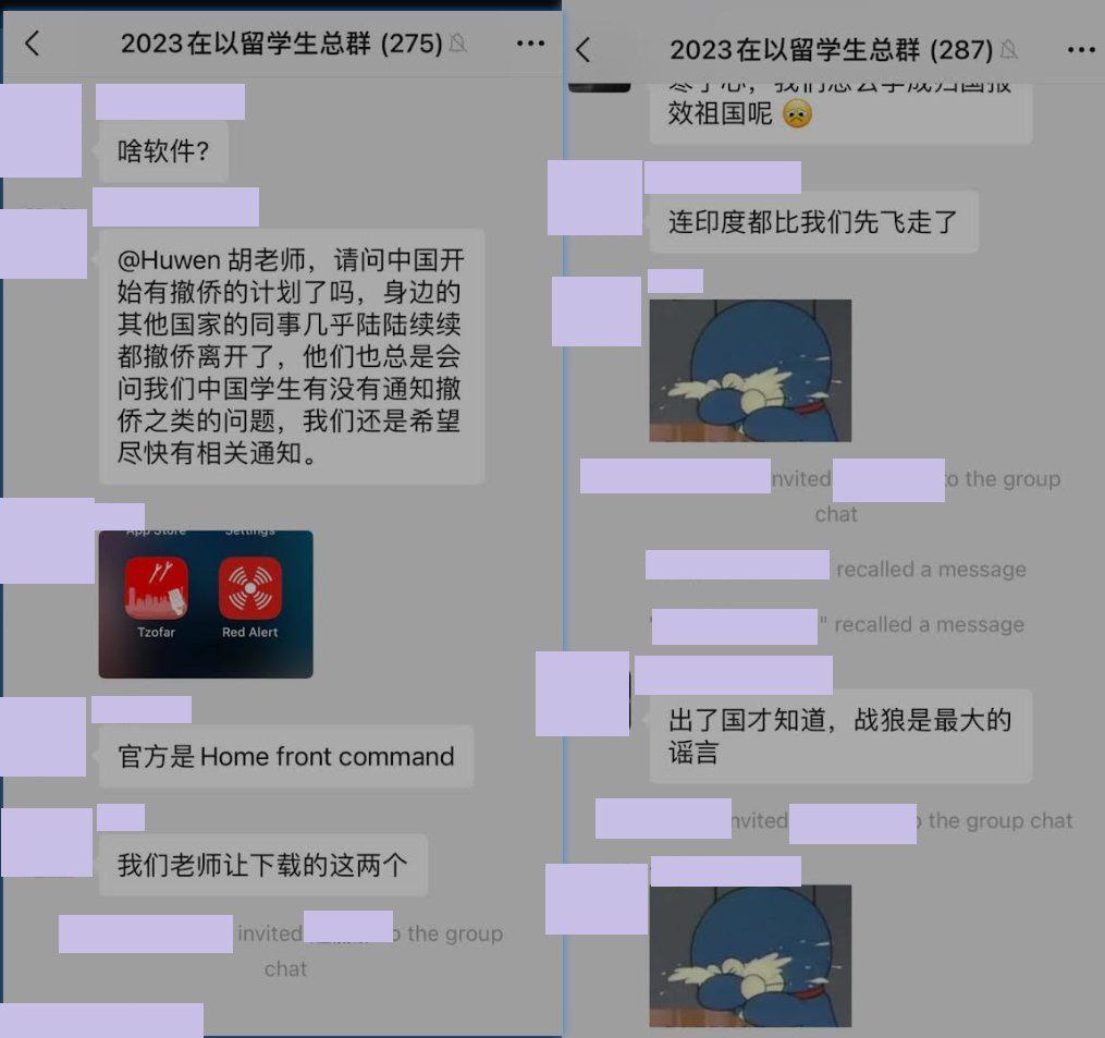 不過,根據在以色列的中國留學生群組的留言截圖顯示,中共當局為中國留學生所提供的