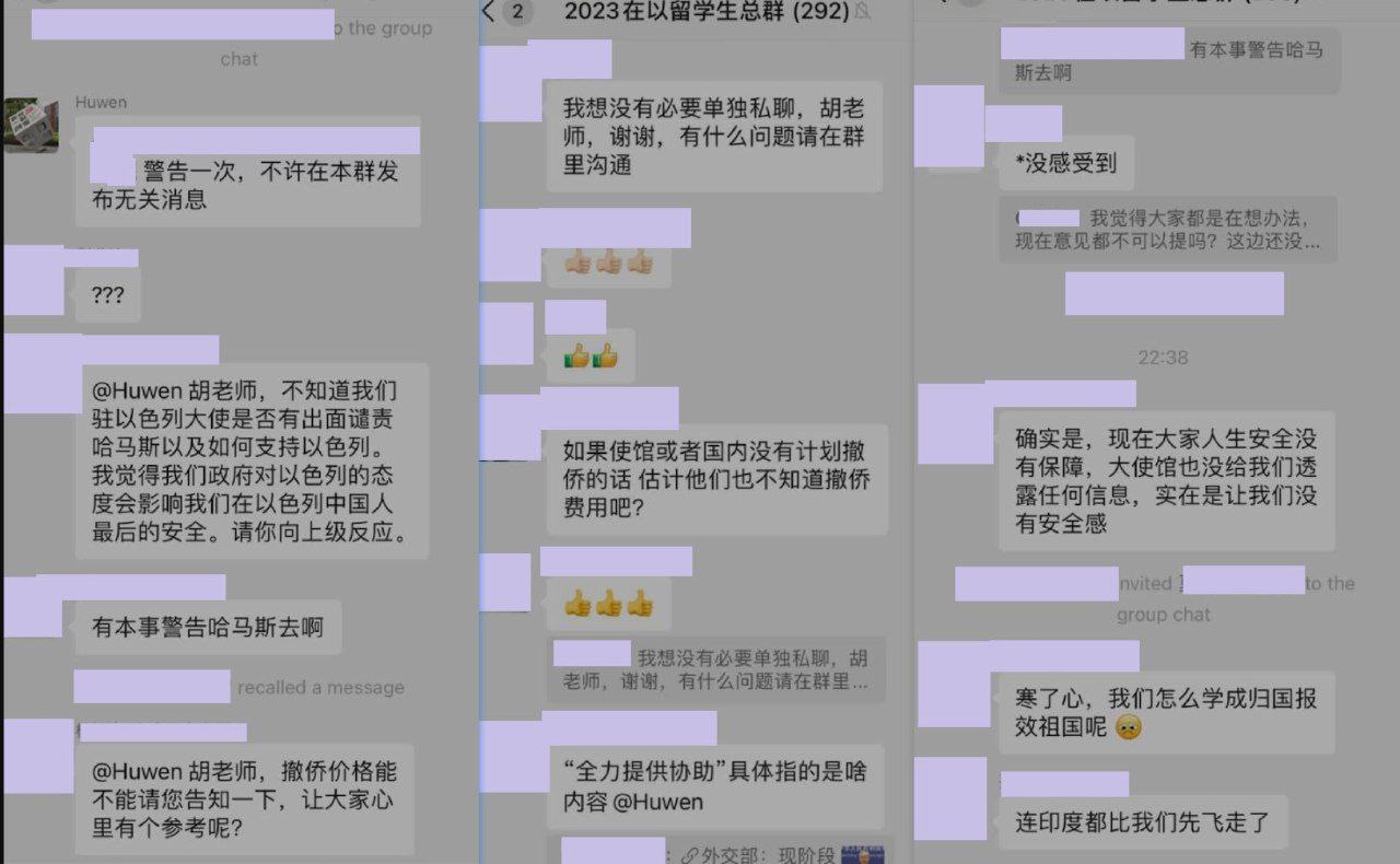 障在以中國公民安全,但根據在以中國留學生曝光的消息,中共並沒有安排撤僑,另有「