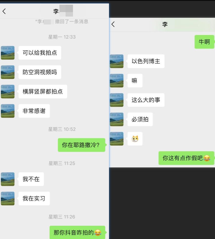 另外,還有人將一名「在以中國留學生」拍攝的視頻發到群裡,這名所謂的「在以中國留