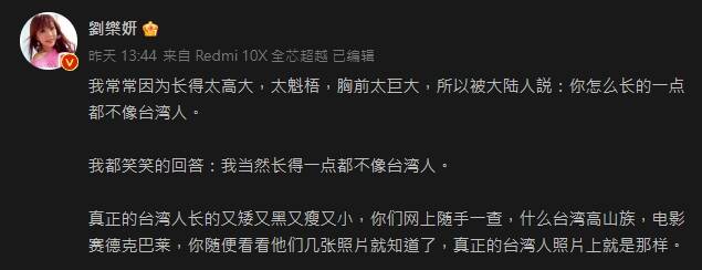 劉樂妍表示自己被中國朋友詢問「怎麼不像台灣人」,她表示自己長得魁梧,更自豪認為