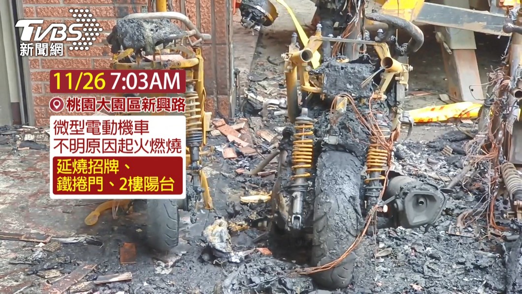 26日早上7點多,桃園大園區新興路上,一處住宅門前的微型電動機車,不明原因起火燃