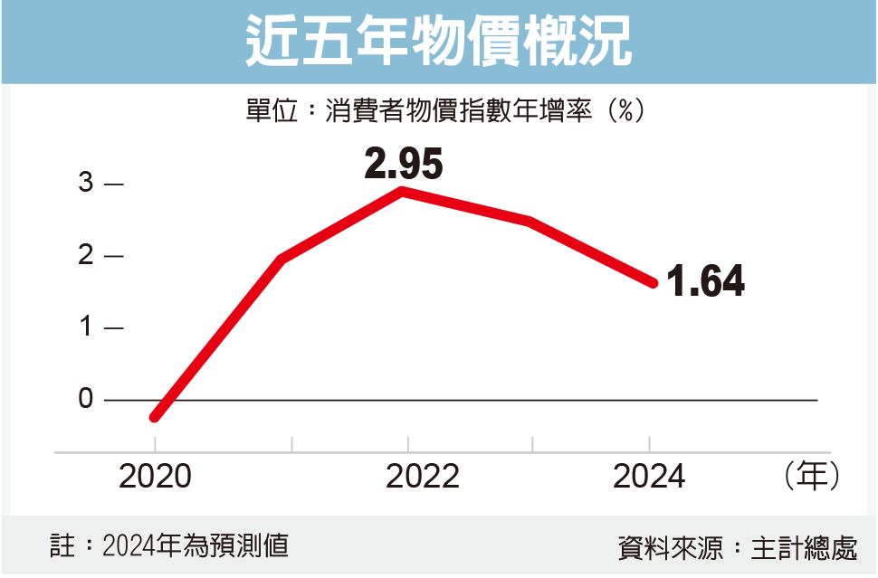 主計總處預估,2024年全年CPI年增率可望回落至2%以下,去年底預測為1.64%,據目前觀