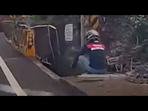重機騎士摔飛「塞進水溝」起火 路過外籍生急喊下車救人