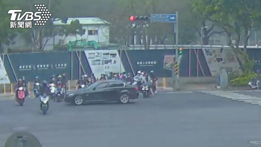 燈穿越馬路,導致另一方向綠燈起步的2輛機車當場被撞飛,騎士與後座乘客重摔在地。