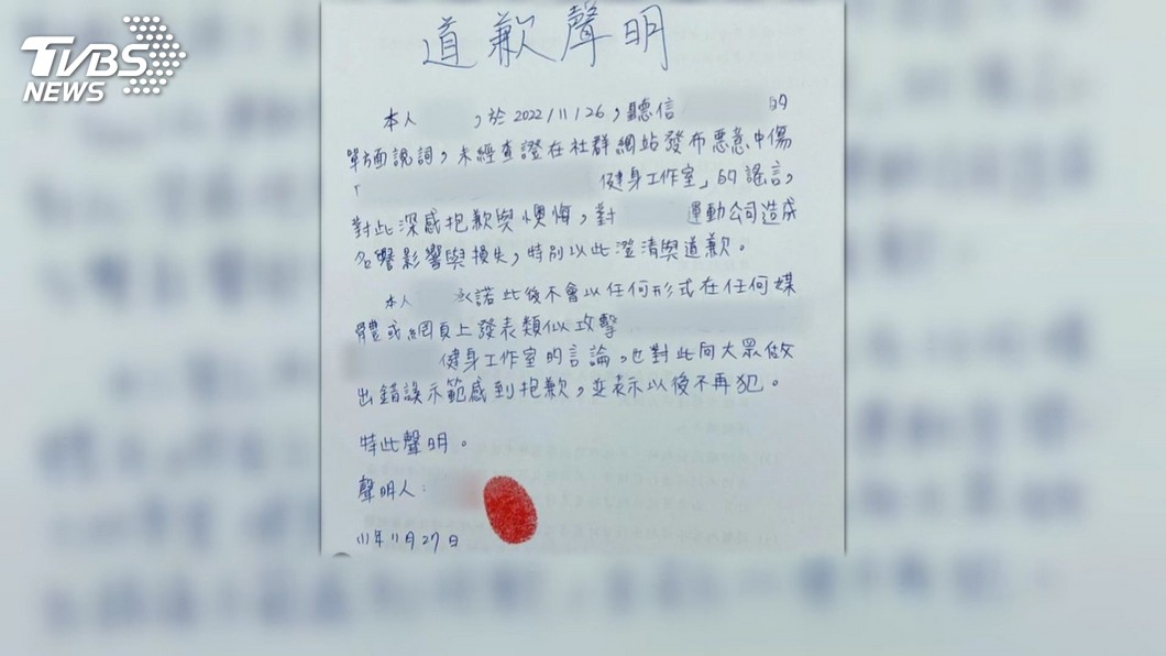 女網紅道歉影片:「未經查證在社群網站發布惡意中傷。」