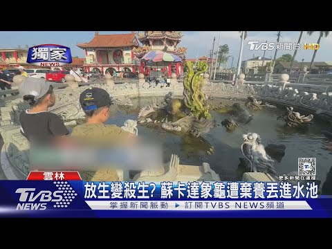 日前有遊客到雲林馬鳴山鎮安宮遊玩時,發現竟然有飼主棄養蘇卡達象龜,還把它進水池