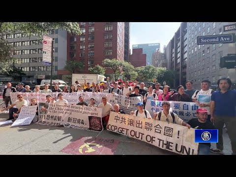 週二(9月23日)聯合國大會一開幕,海外的民主團體和抗議者就在聯合國總部外和中共