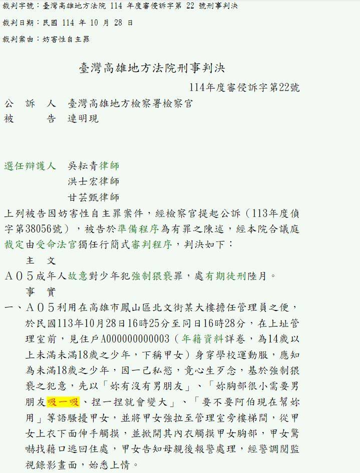 判決指出,去年10月28日下午4點多,16歲少女小美(化名)放學回家,經過管理室時突然