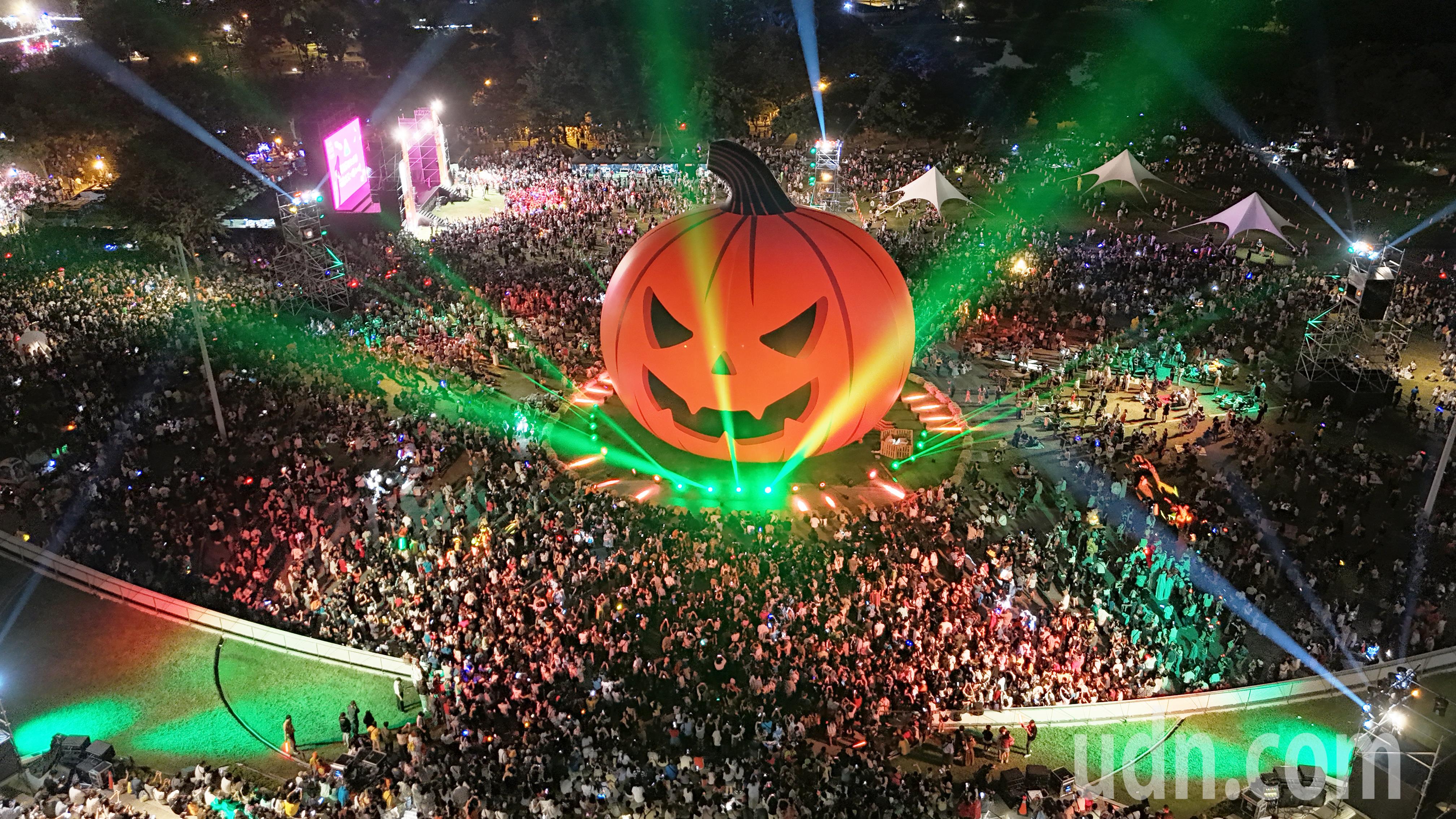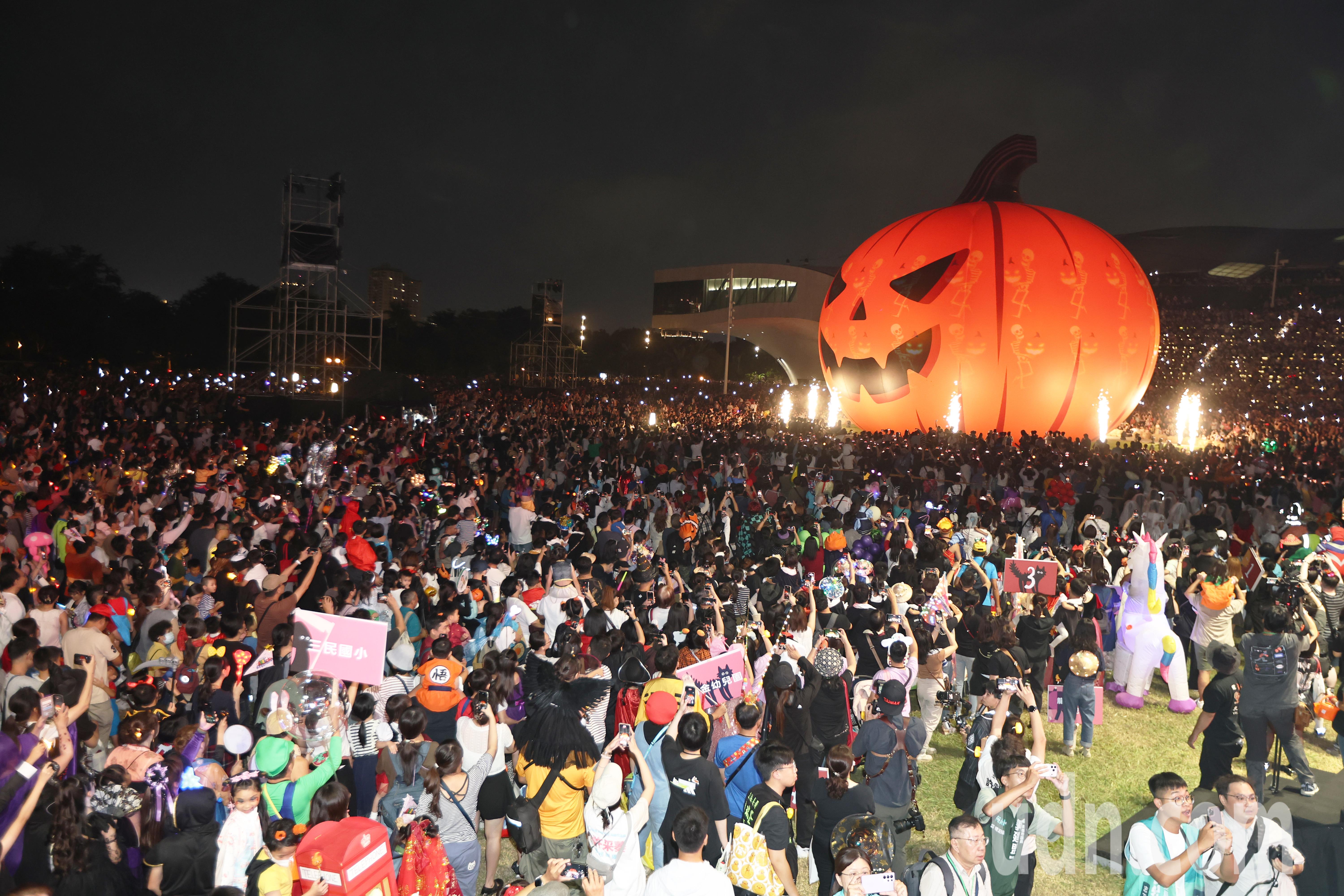 裝扮遊行最高潮時全場近70,000人,現場在繽紛燈光與音樂節奏中,巨型22公尺「大南瓜