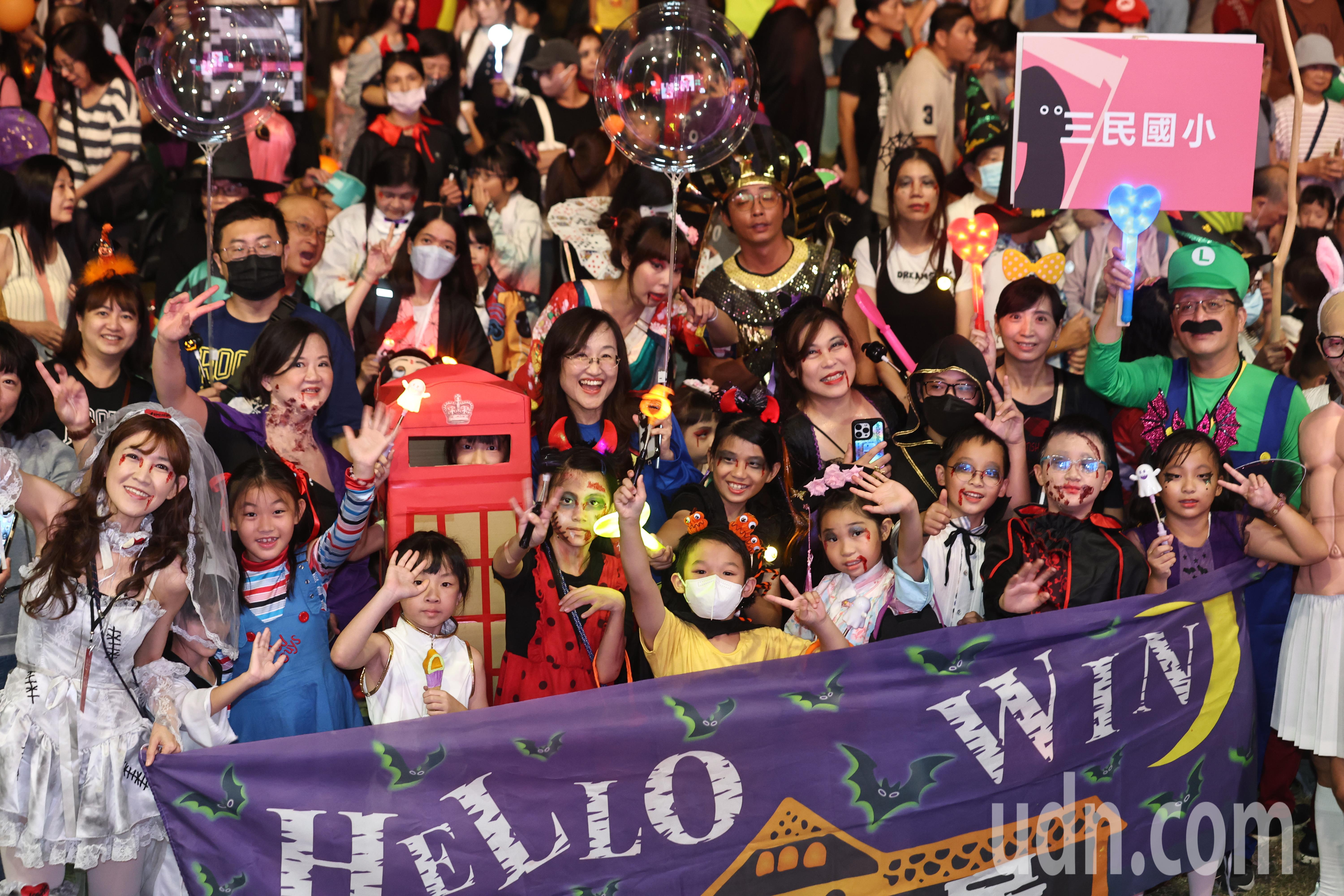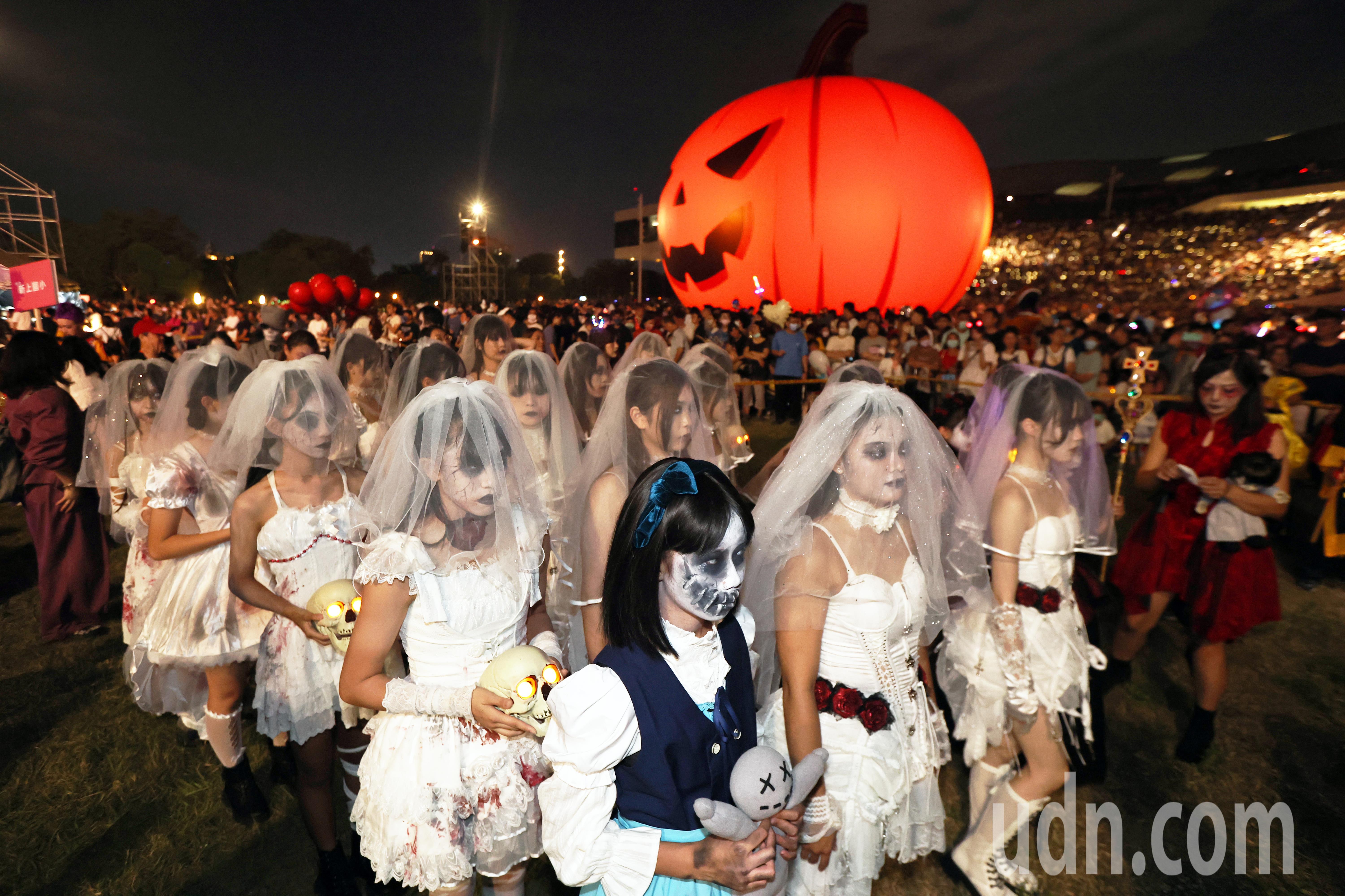 現場民眾熱情參與萬聖節創意裝扮遊行,沿途有著萬聖節造景與燈光特效,南瓜燈、骷髏