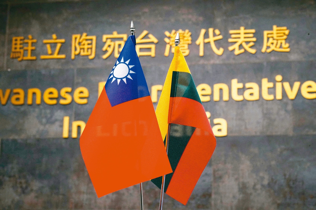 灣在立陶宛的代表處2022年展示雙方國旗。(路透)