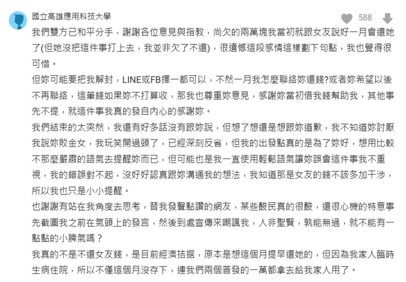未於文章中提及。他表示,目前無法聯絡女方,希望對方能暫時解封LINE或FB,以便還款