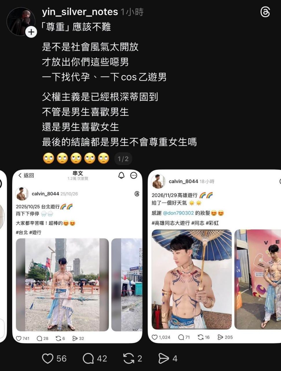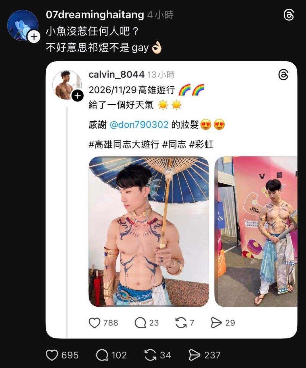 故事是甲甲在高雄同志遊行半裸沒戴假髮cos她們的數位老公,無法接受老公變彩虹因而