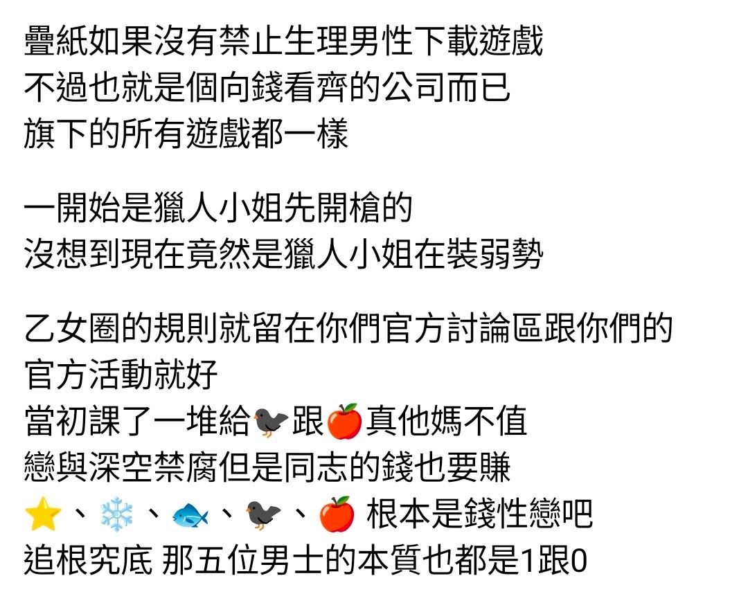 如題,這兩天划脆看到甲甲與戀與深空乙遊女大戰充滿樂子,兩邊都是高濃度台派份子青