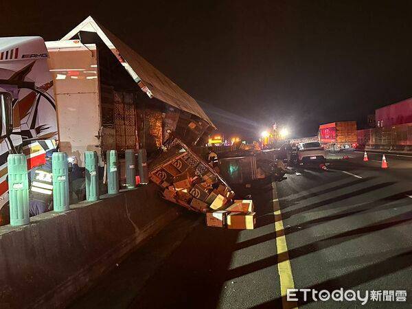 事發於凌晨1時11分,一輛聯結車卡在分隔島附近,一輛黑色廂型車嚴重凹陷毀損,地上