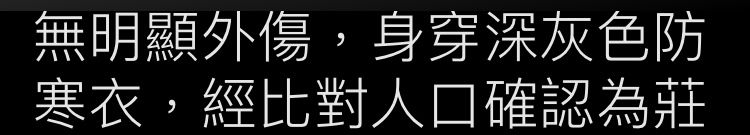 明顯外傷,身穿深灰色防寒衣,經比對人口確認為莊姓老翁,目前已通報家屬確認身份,全