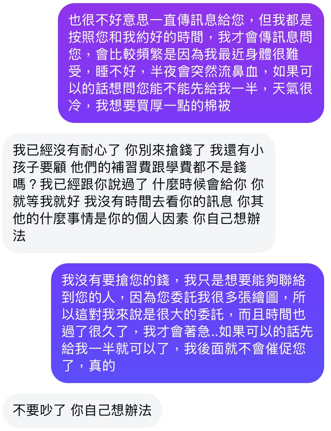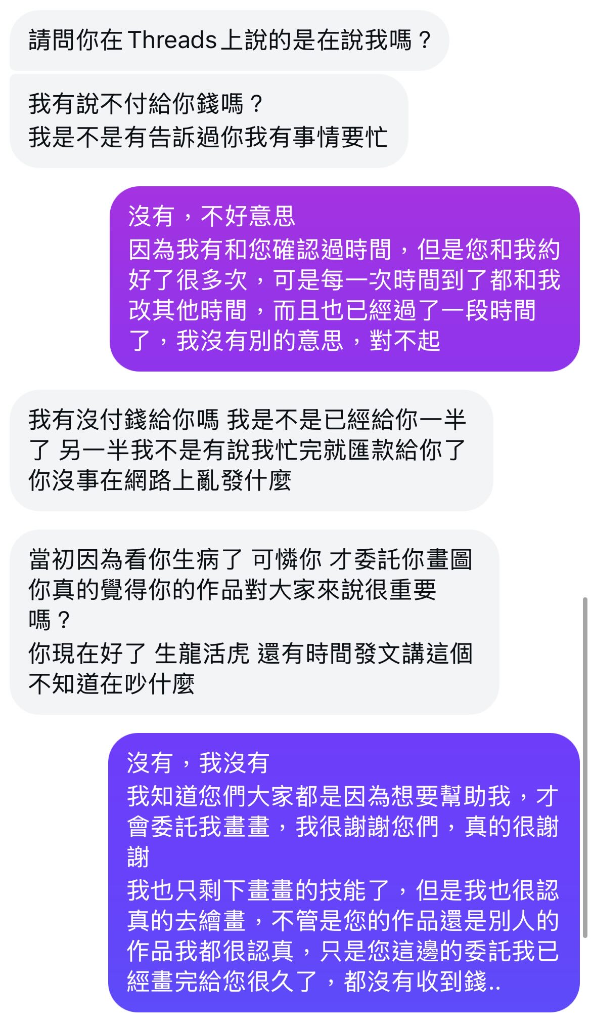 結果應該是有幾位委託者,圖畫完了,一直不肯付款,他就在threads上說了一下,說些錢都是他的救命錢,希望大家能準時付款