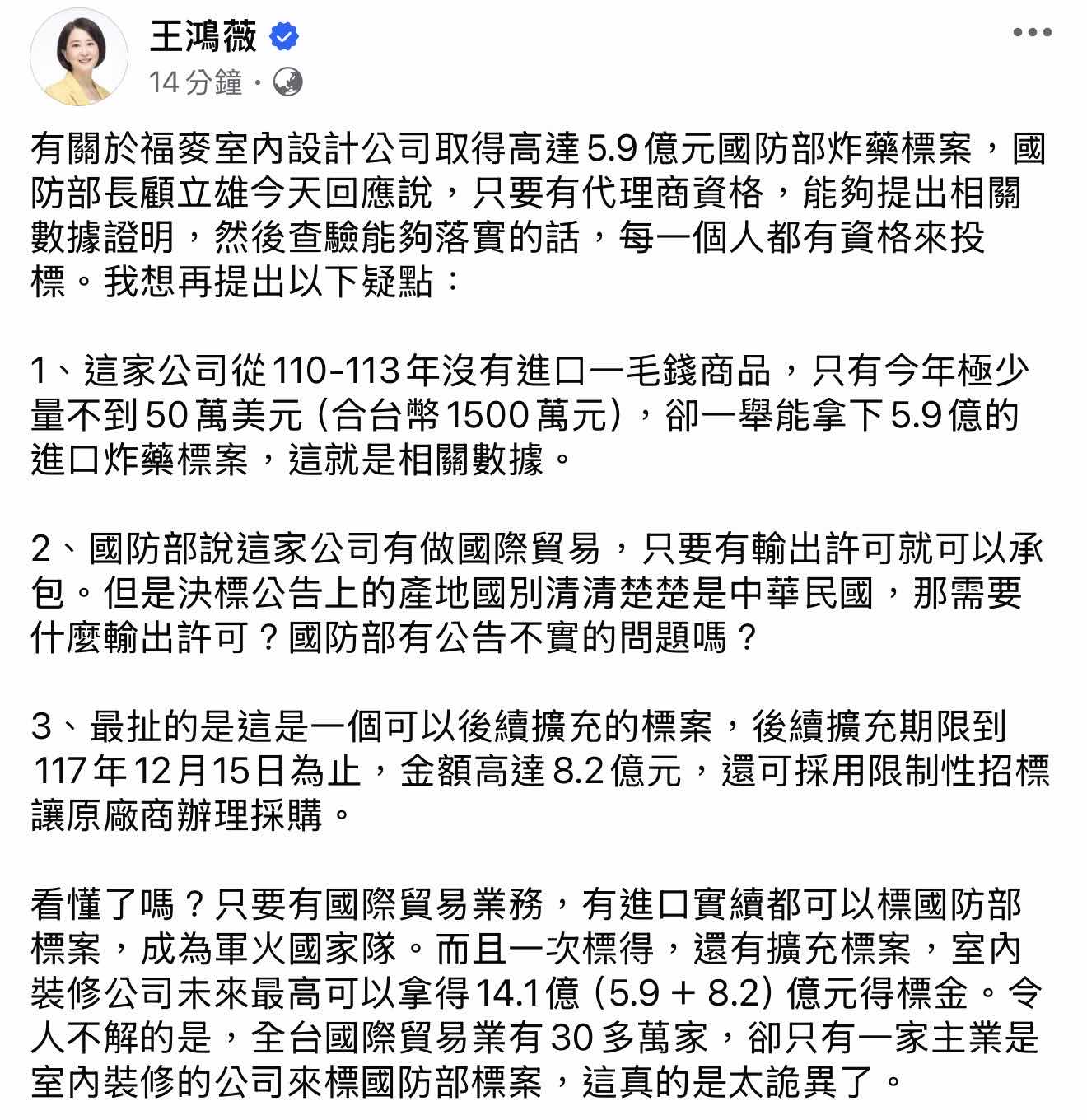 有關於福麥室內設計公司取得高達5.9億元國防部炸藥標案,國防部長顧立雄今天回應說