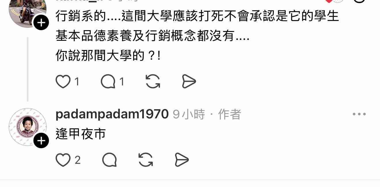 → jinkela1: 到底是逢甲教育失敗 還是是台女本性?3F 36.227.3.109 台灣 12/12 15:44