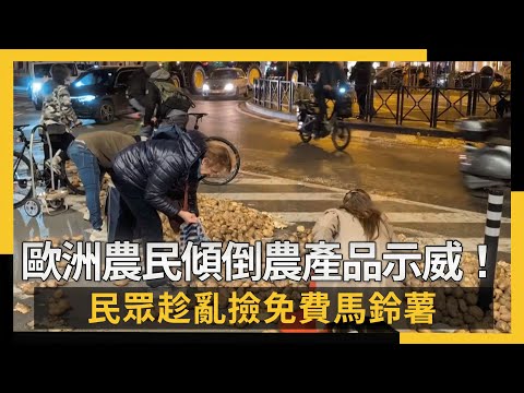 影/歐洲農民開拖拉機、傾倒農產品示威!民眾趁亂撿免費馬鈴薯