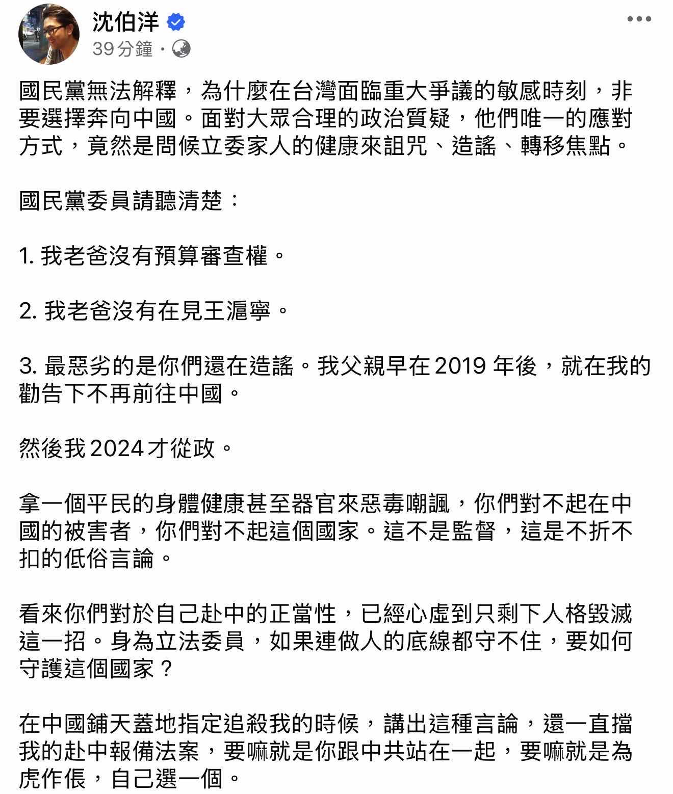 作者 PealRay (PealRay)標題 [爆卦] 沈伯洋:國民黨造謠我爸2019年後仍赴中國時間 Mon Dec 22 14:05:09 2025