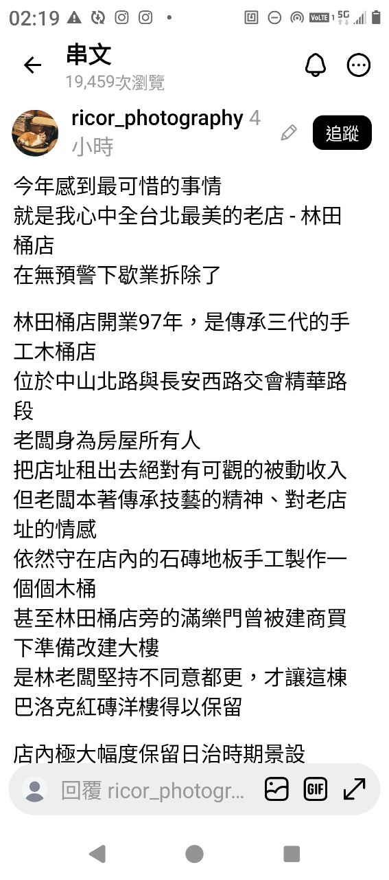 中山北路跟長安西路口的林田桶店拆掉了,以前裡面賣很多泡澡的大木桶,有沒有這間店
