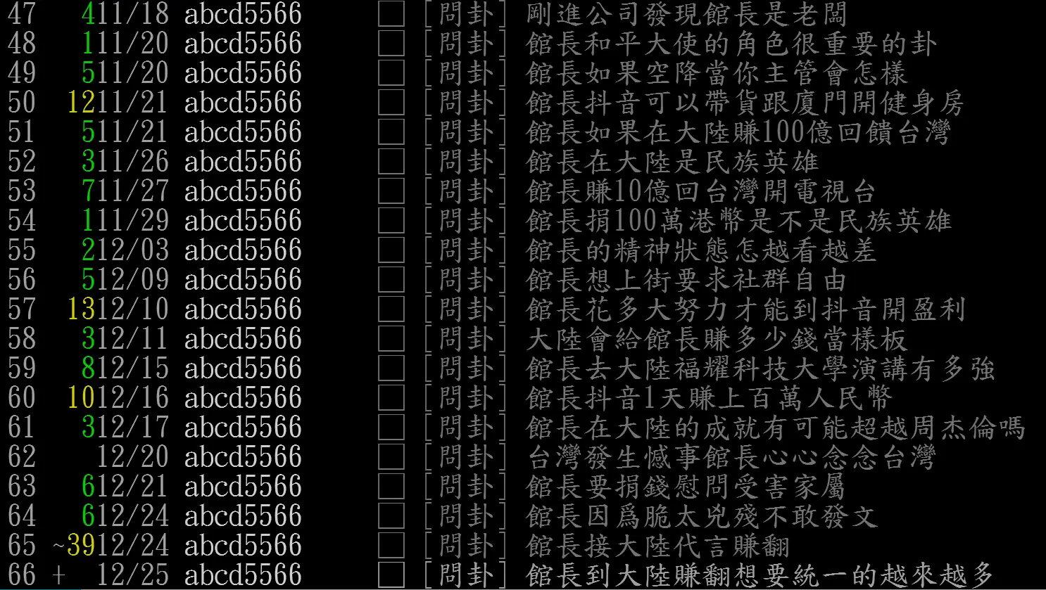 作者 abcd5566 (塔綠班都垃圾)標題 [問卦] 館長到大陸賺翻想要統一的越來越多時間 Thu Dec 25 12:45:22 2025