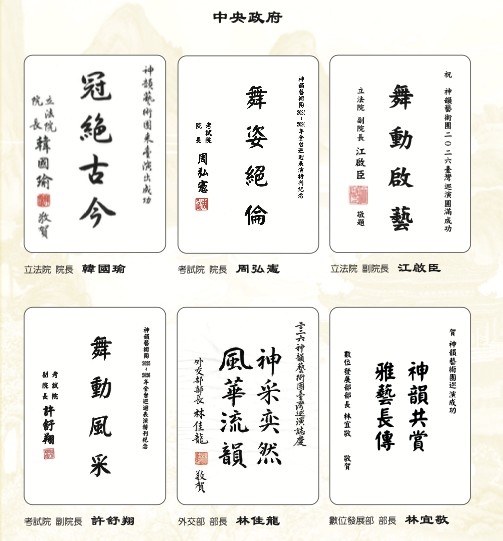 佳龍等120位中央政府官員及地方政府首長紛紛致贈賀詞,歡迎神韻來到台灣,為台灣民