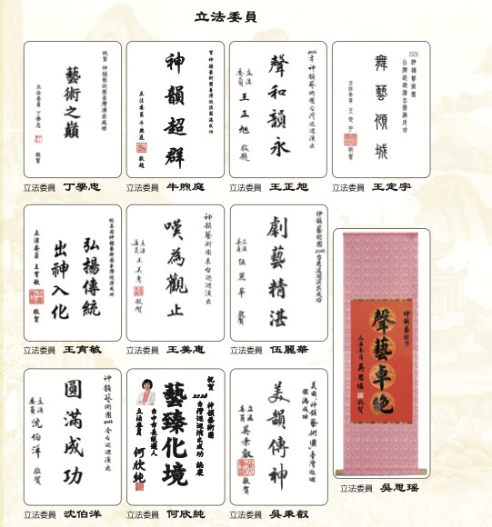,聲妙悅韻」;台南市長黃偉哲題贈「神飛彩袖,韻潤芳華」;高雄市長陳其邁則以「藝