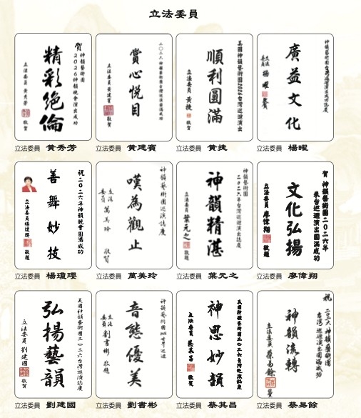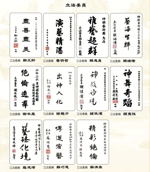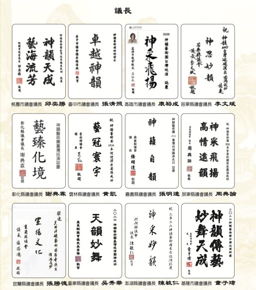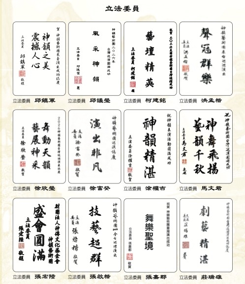 題贈「神韻共賞、雅藝長傳」,法務部政務次長黃世杰以「藝壇精英」致意。