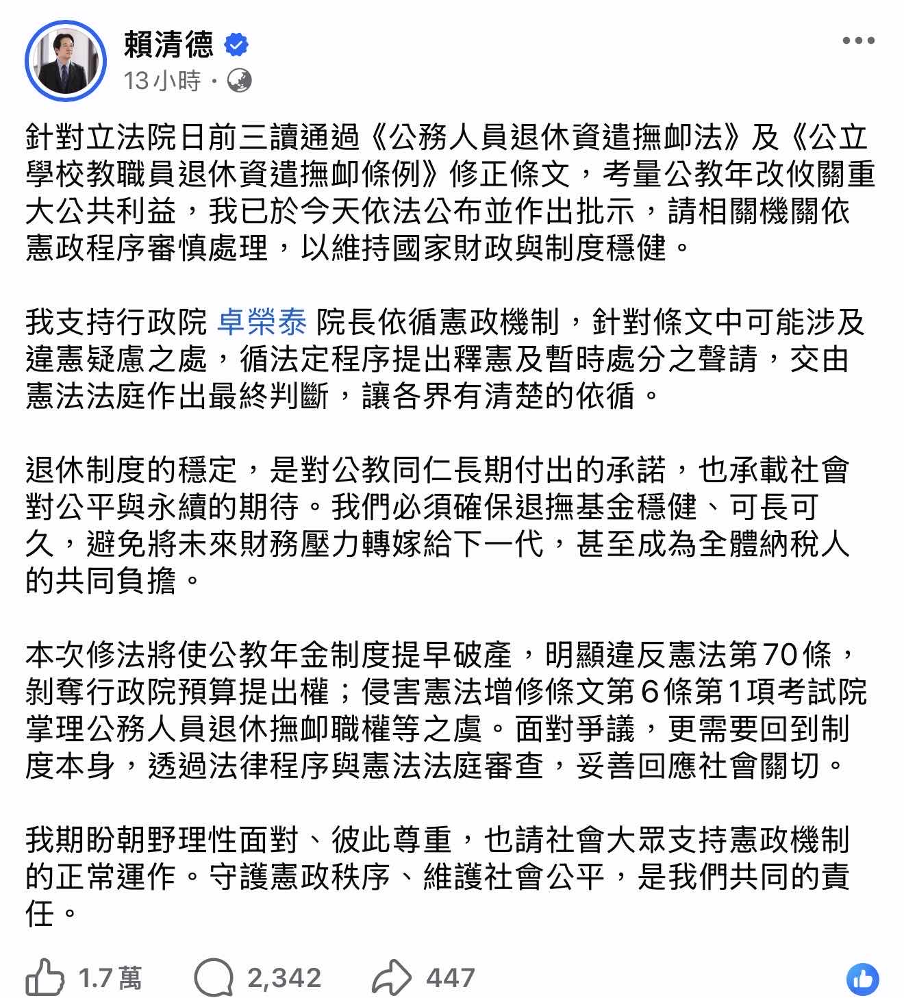 作者 PealRay (PealRay)標題 [爆卦] 賴清德:公職退休資遣撫卹法修法明顯違憲時間 Sat Dec 27 09:50:00 2025